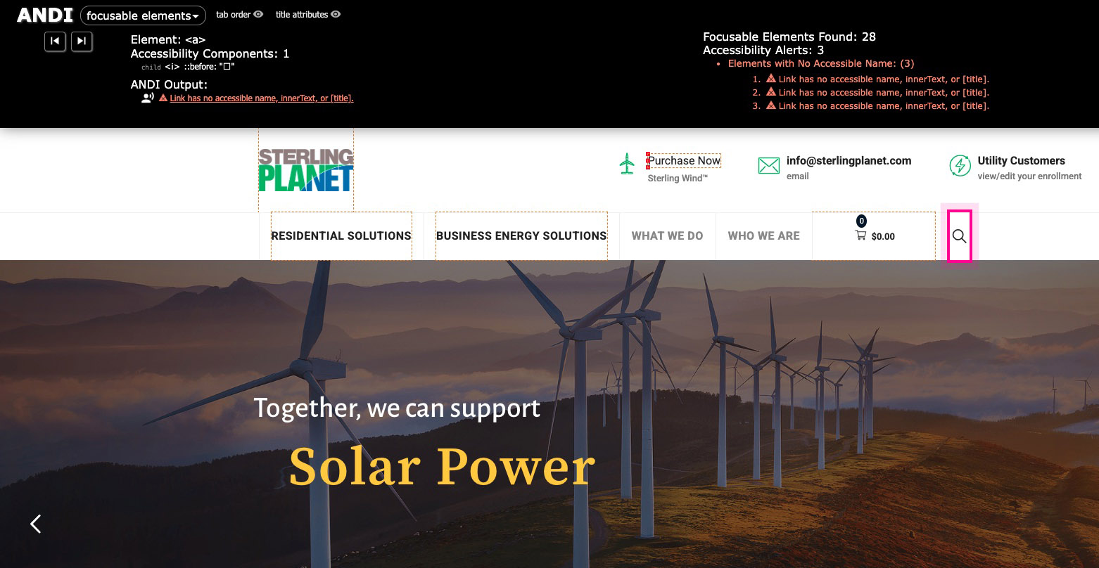 "banner1"should use a more descriptive alternative like"Solar power installation"so users understand what is being shown. - Positive findings: tab order and skip links. On the positive side, most pages followed a logical tab order that aligned with the visual reading sequence, which supports efficient keyboard navigation. In addition, each page included a “skip to content” link at the top, allowing keyboard and screen reader users to bypass repeated navigation and move directly to the main content area.