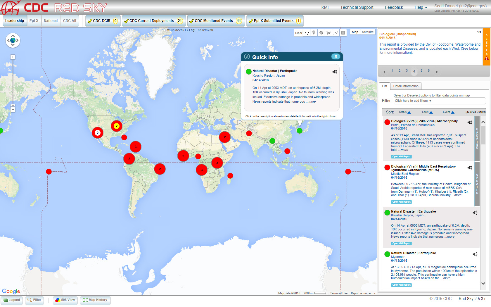 The result was Red Sky, a dynamic, real-time data visualization dashboard that displays global public health events as color-coded points on a Google Map. Each color indicates CDC’s level of involvement from “monitoring” to full deployments worldwide. Hovering over a point reveals a Quick Info dialog with a brief description; selecting the text zooms into the event location and opens a detail view that can include attachments, maps, data tables, and situation reports.