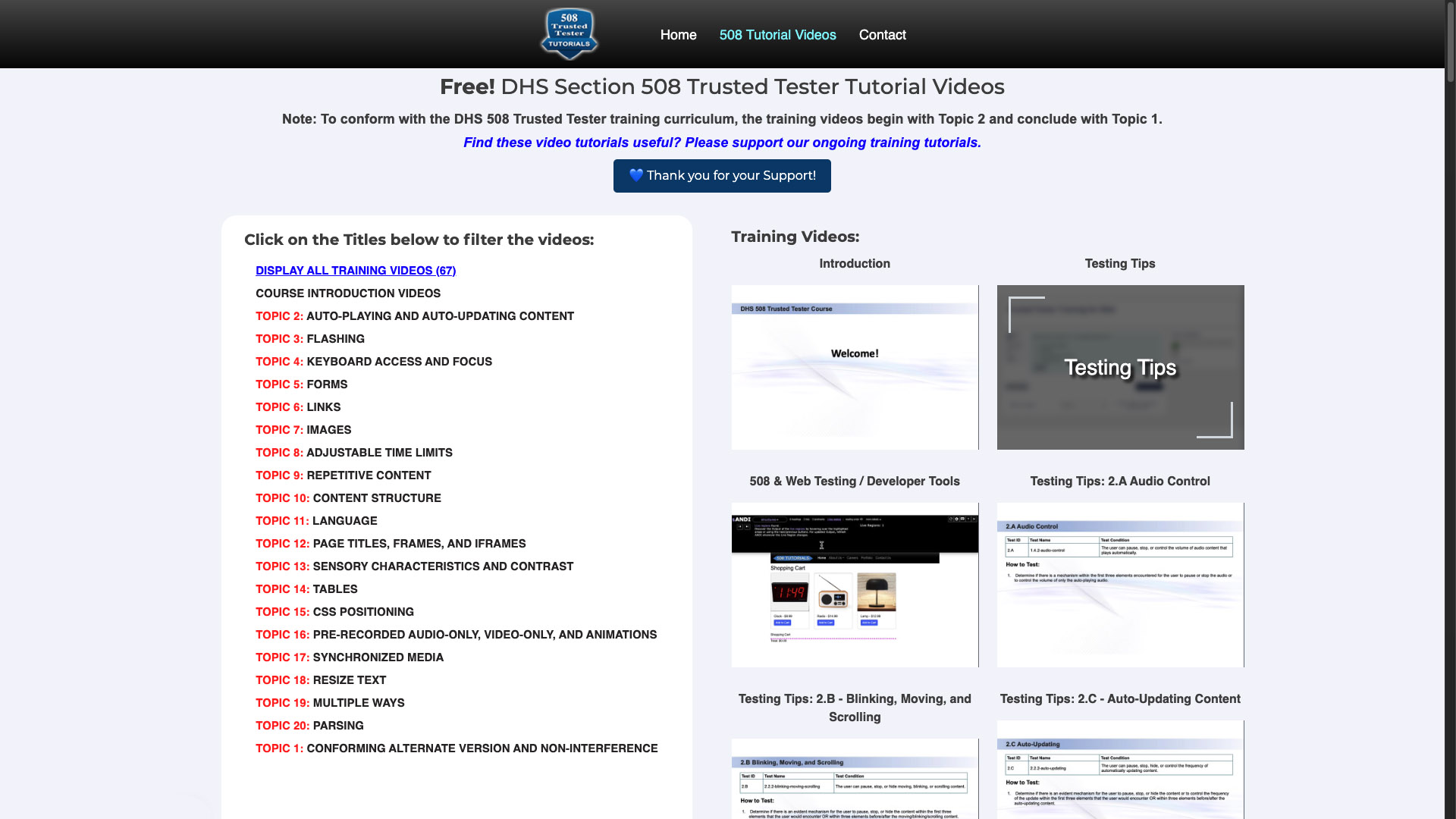 Recently, to help others pass the difficult DHS Section 508 Trusted Tester exam, I created 508tutorials.com, a site with over 60 videos that walk users through the testing process and, more importantly, teach them how to think like a Trusted Tester so they can apply those skills on real-world projects.